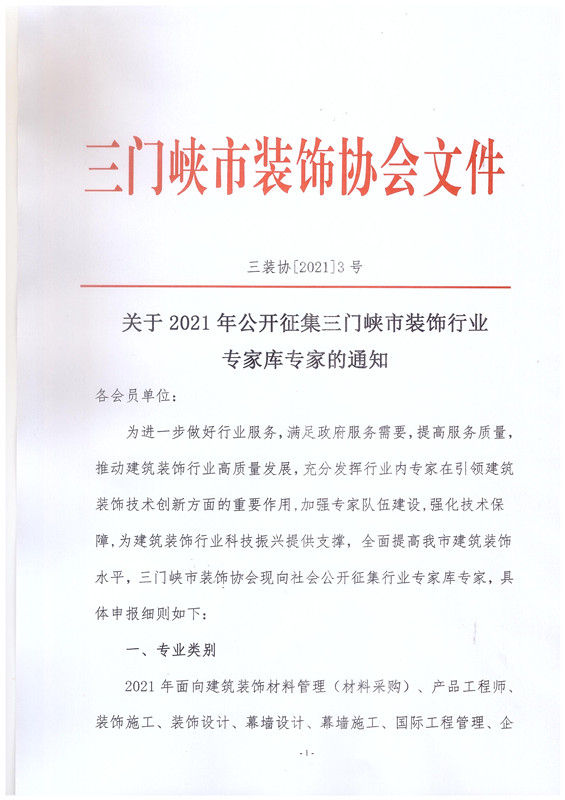 关于2021年公开征集三门峡市装饰行业专家库专家的通知